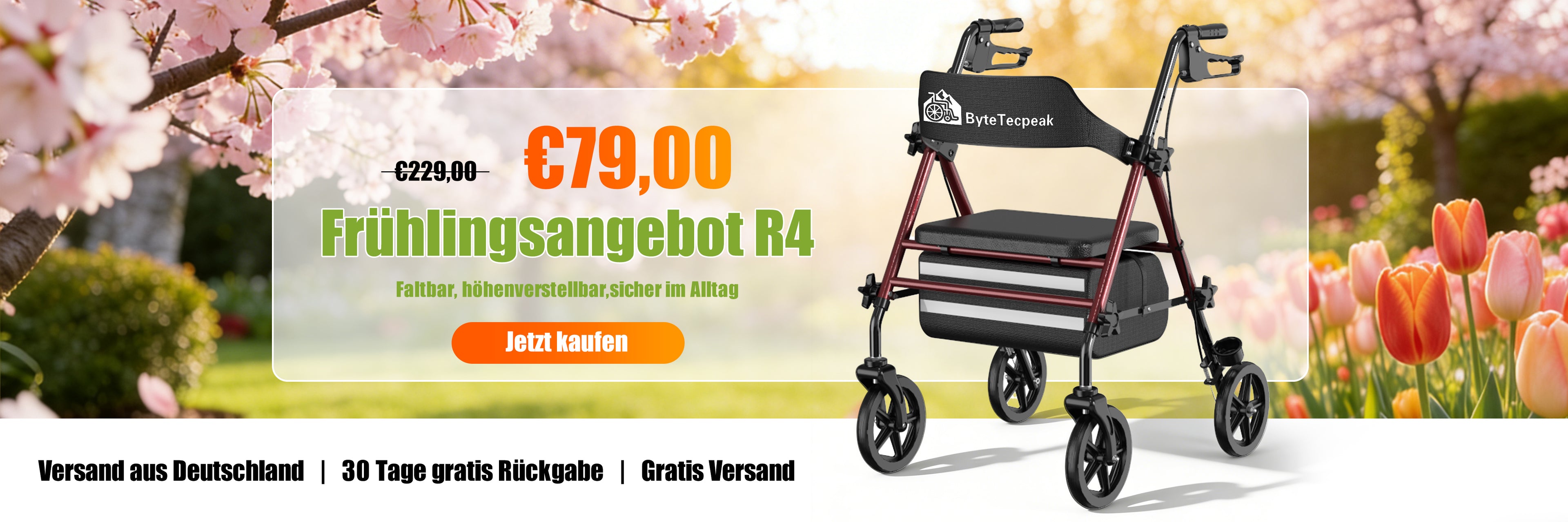 ByteTecpeak R2 Leichtgewicht Rollator mit Sitz, klappbar & höhenverstellbar bis 100 kg