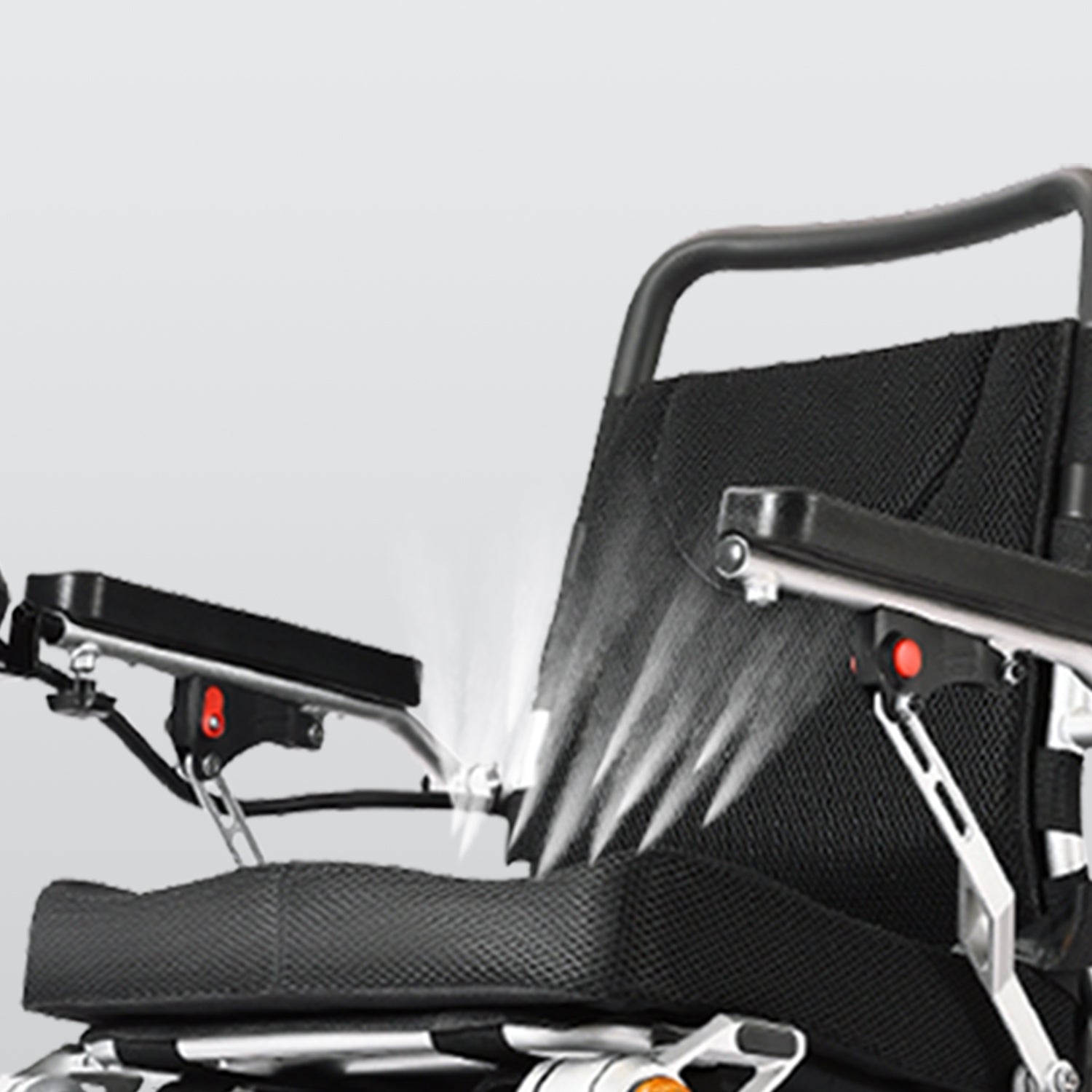 The wheelchair frame is made of high quality aluminum which is both lightweight and durable. It supports up to 150kg and weighs only 33.2kg (including battery).