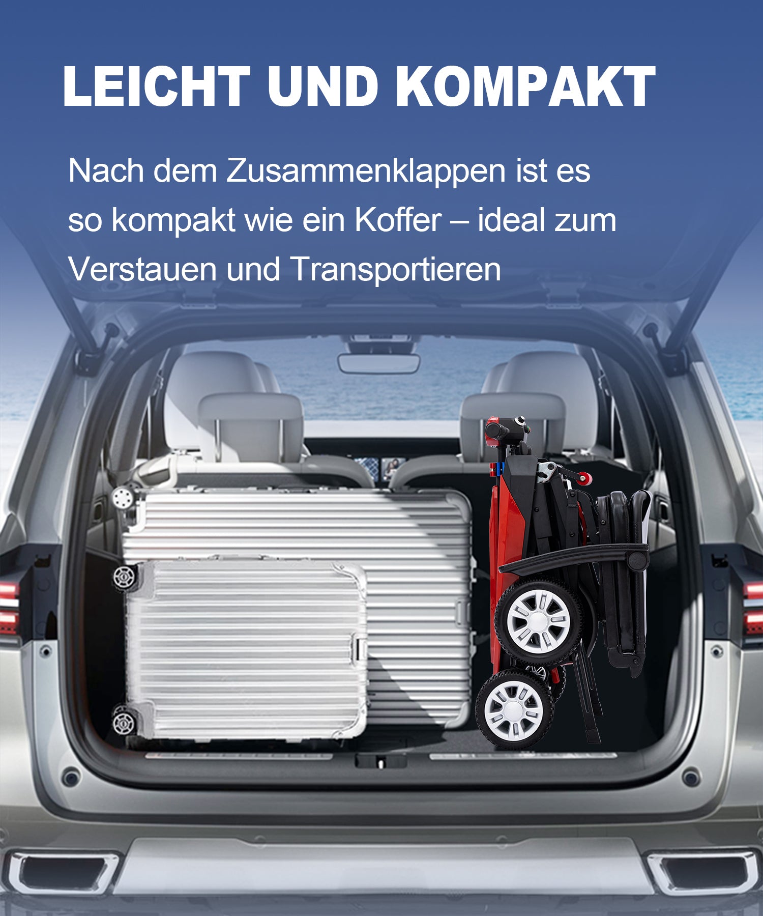 Ce véhicule électrique se plie rapidement et se range facilement dans le coffre – idéal pour les excursions, les voyages ou une utilisation quotidienne.