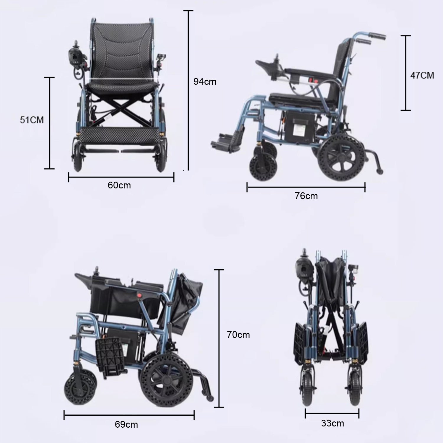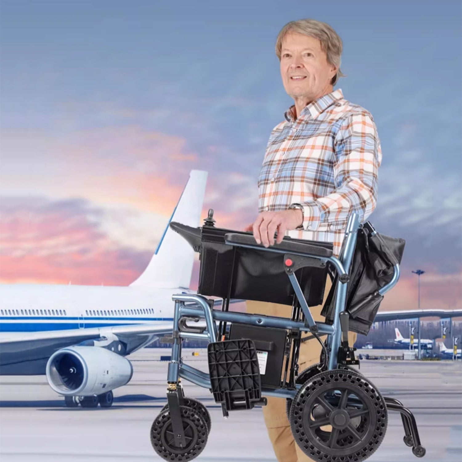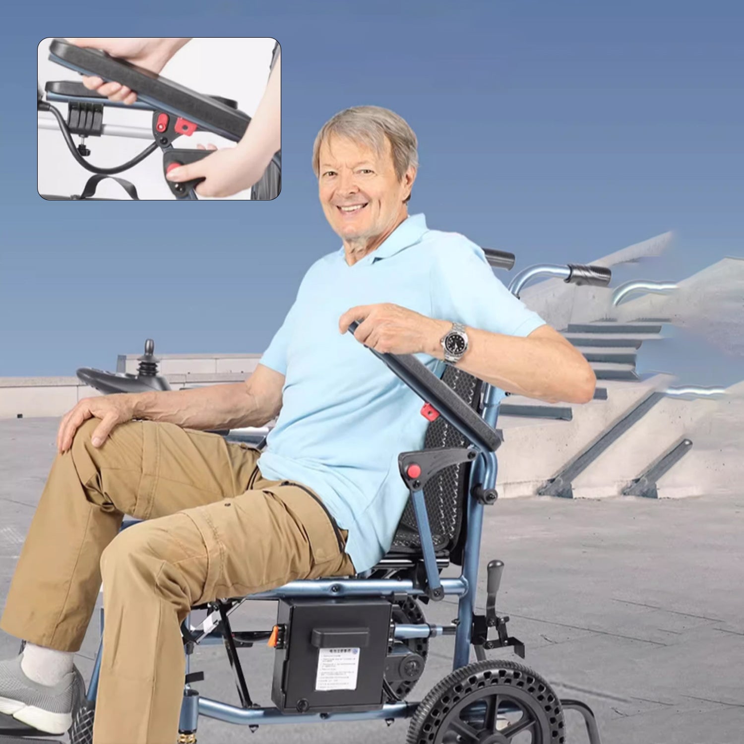 Kerekesszékünk ultrakönnyű, és mindössze 16 kg-ot nyom (akkumulátor nélkül), ami megkönnyíti a kezelést és a mobilitást. Mindössze 3 másodperc alatt összehajtható kompakt méretre: 78 x 33 x 90 cm, tökéletes kis csomagtartókba és szűk helyekre.