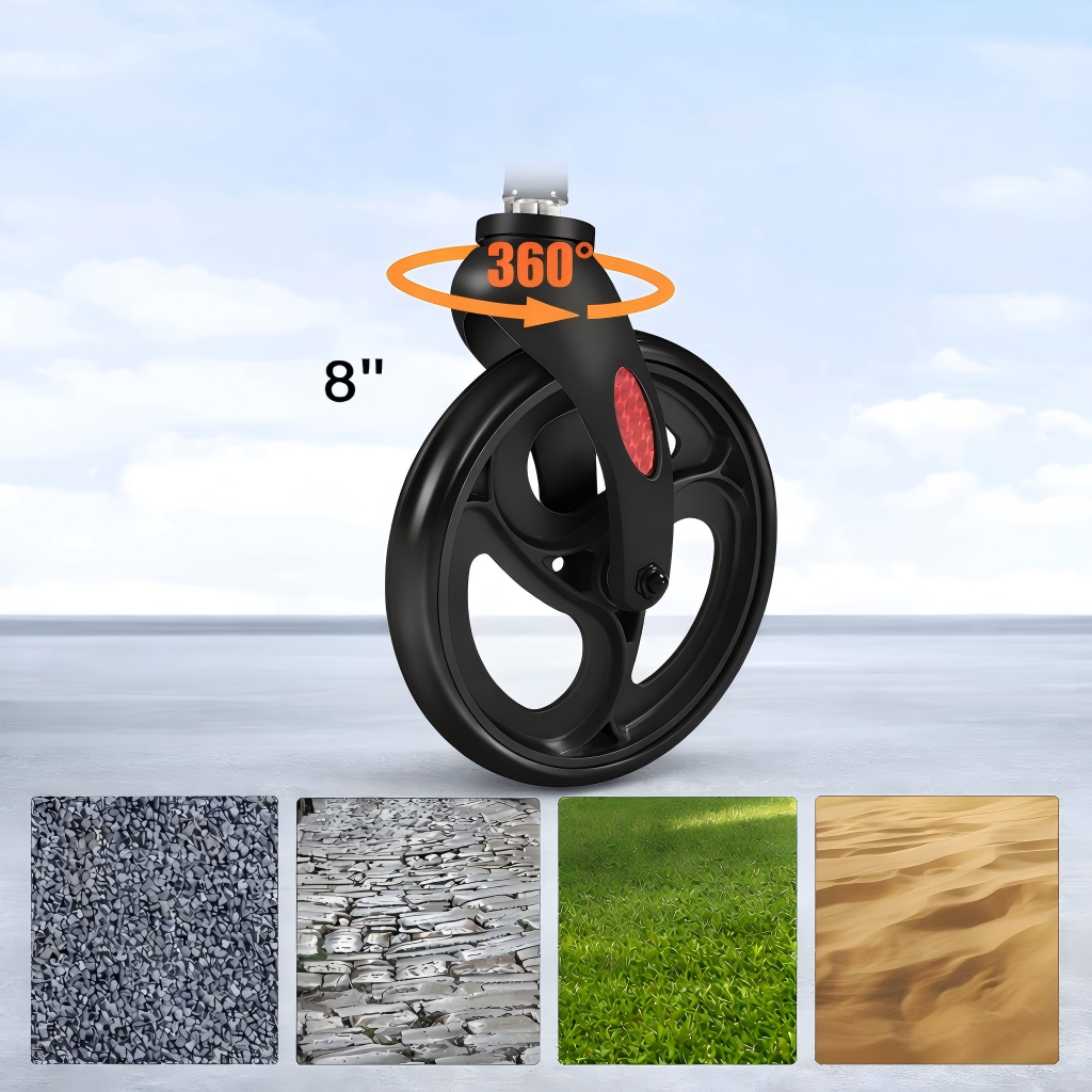 Le ruote da 8-Zoll con funzione di rotazione a 360° consentono un facile manovrare su diversi fondi. Che si tratti di pavé, erba o ghiaia – restate flessibili e mobili.