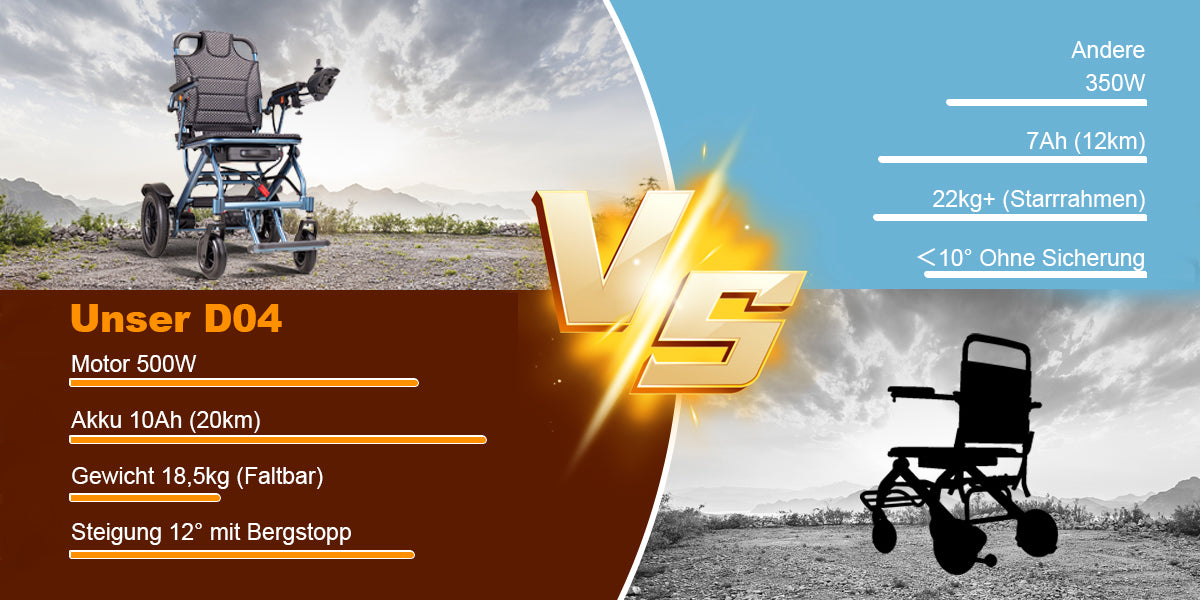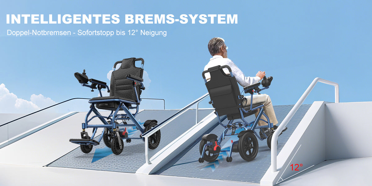 Ausgestattet mit einem kraftvollen 500W Elektromotor und einem elektromagnetischen Bremssystem, bietet der Rollstuhl eine starke Leistung und zuverlässige Sicherheit, auch bei Steigungen.