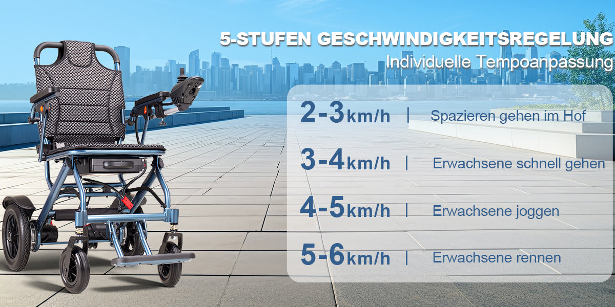 von 2 km/h bis 6 km/h. Die Geschwindigkeit lässt sich flexibel an die individuellen Bedürfnisse des Nutzers sowie an verschiedene Fahrbedingungen anpassen.