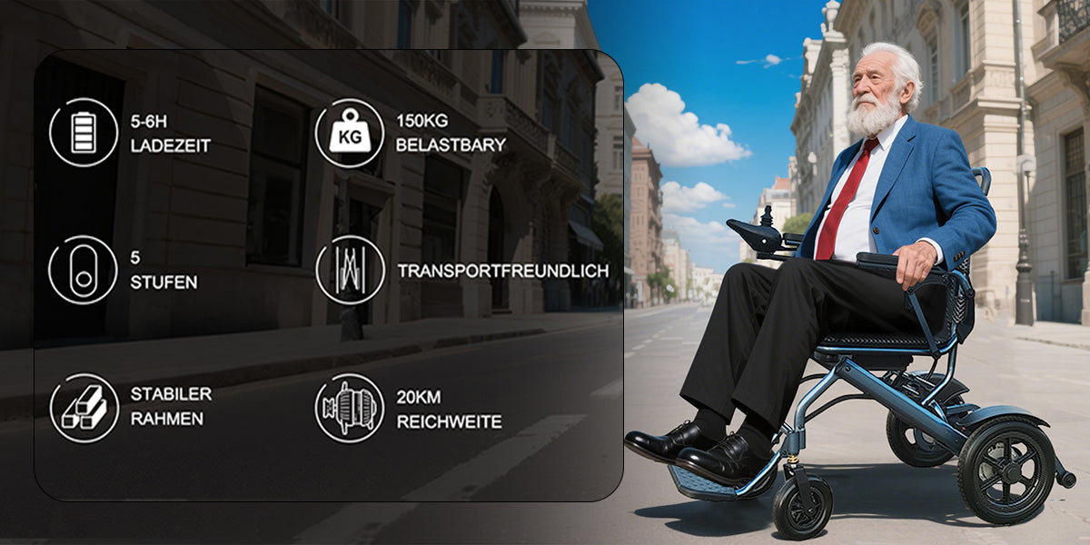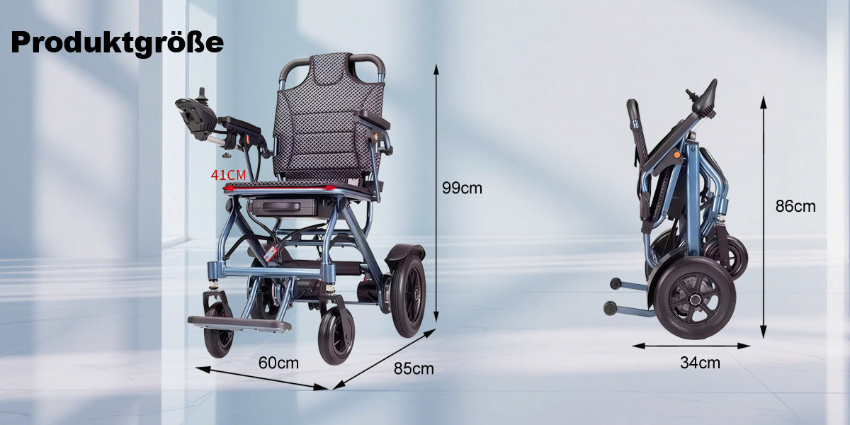 Mit nur 17,9 kg (ohne Akku) lässt sich der Rollstuhl schnell zusammenklappen und platzsparend verstauen – perfekt für Reisen, Auto- und Flugzeugtransport.