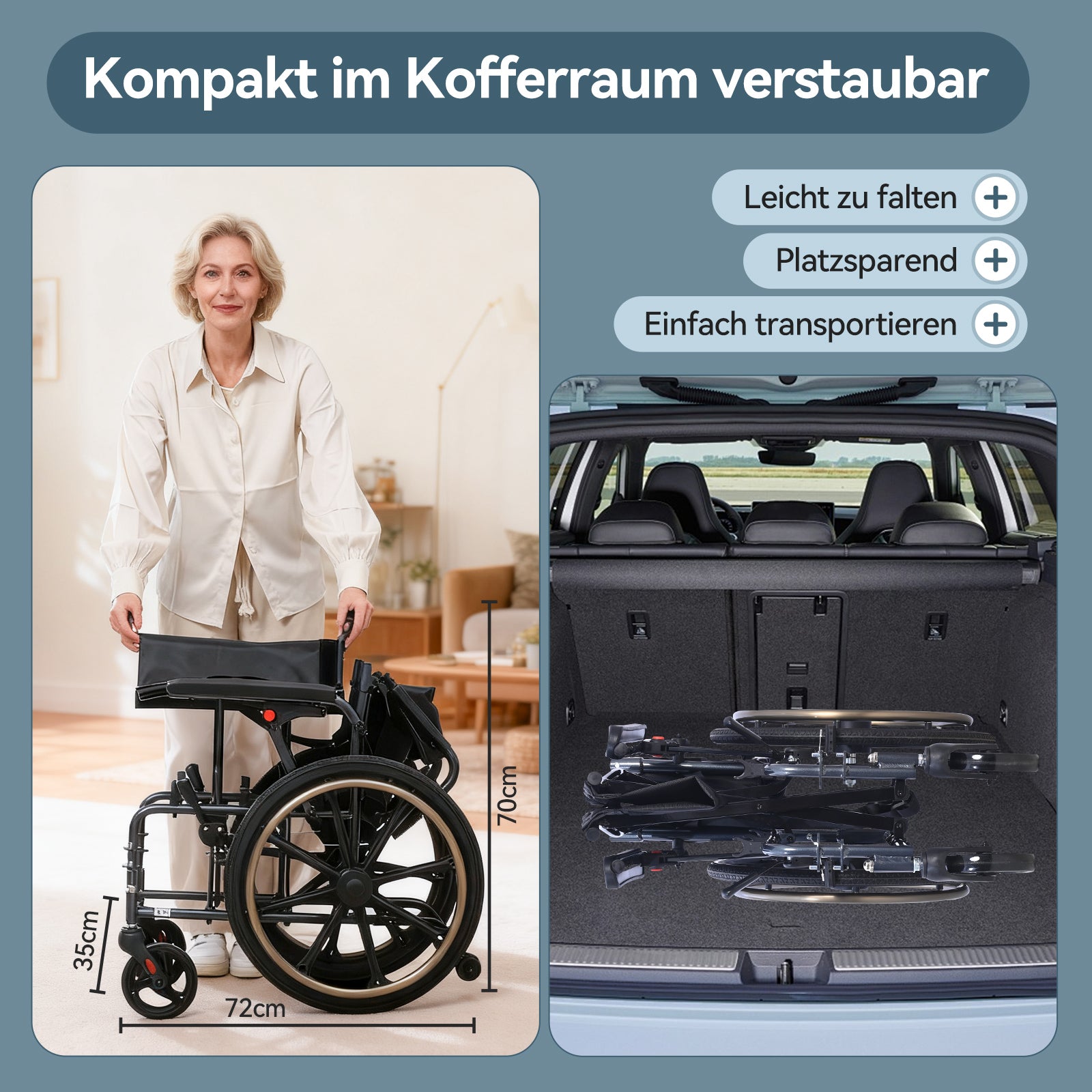 Der Rollstuhl lässt sich schnell und einfach zusammenklappen und platzsparend verstauen. Ideal für den Transport im Kofferraum sowie für den mobilen Einsatz im Alltag und auf Reisen.