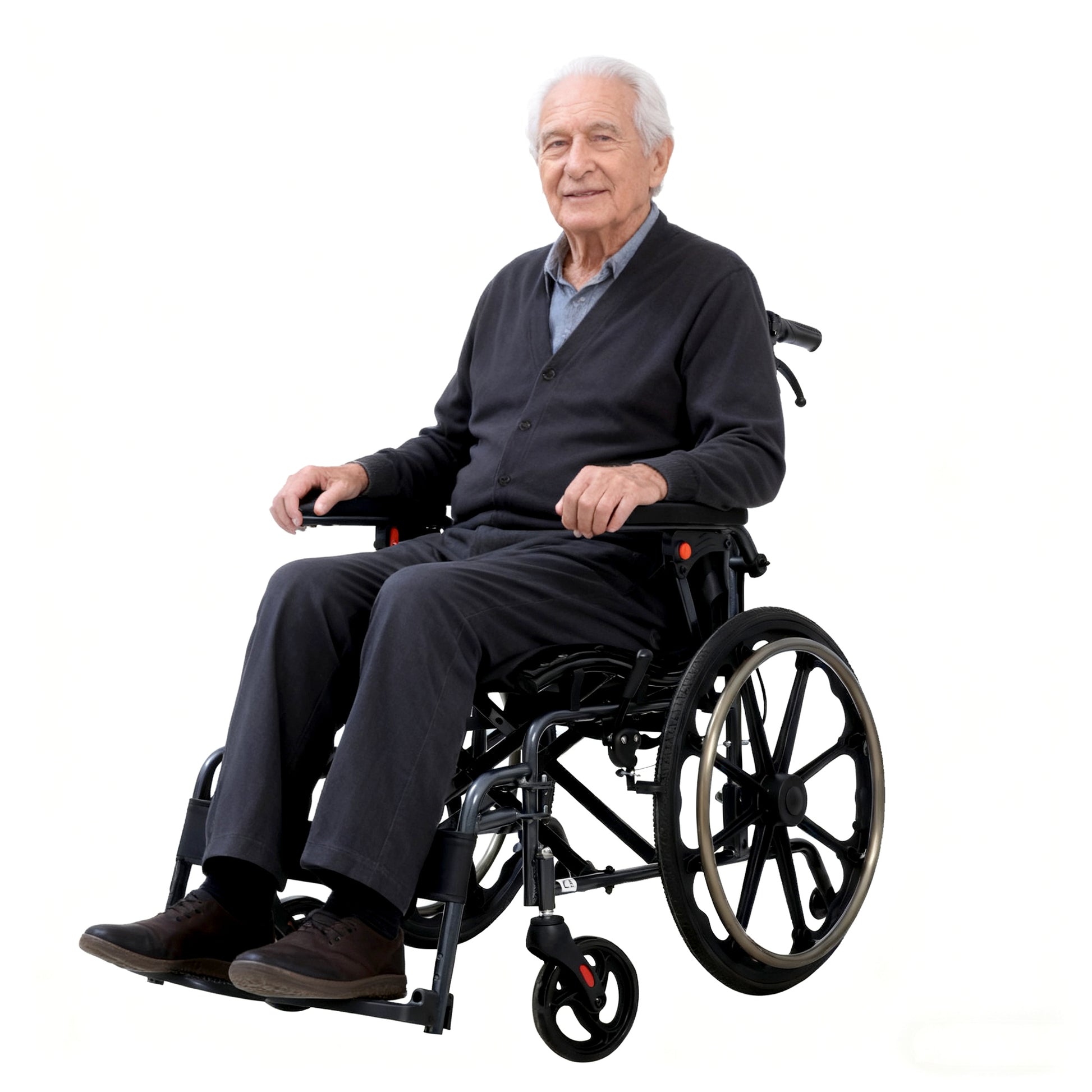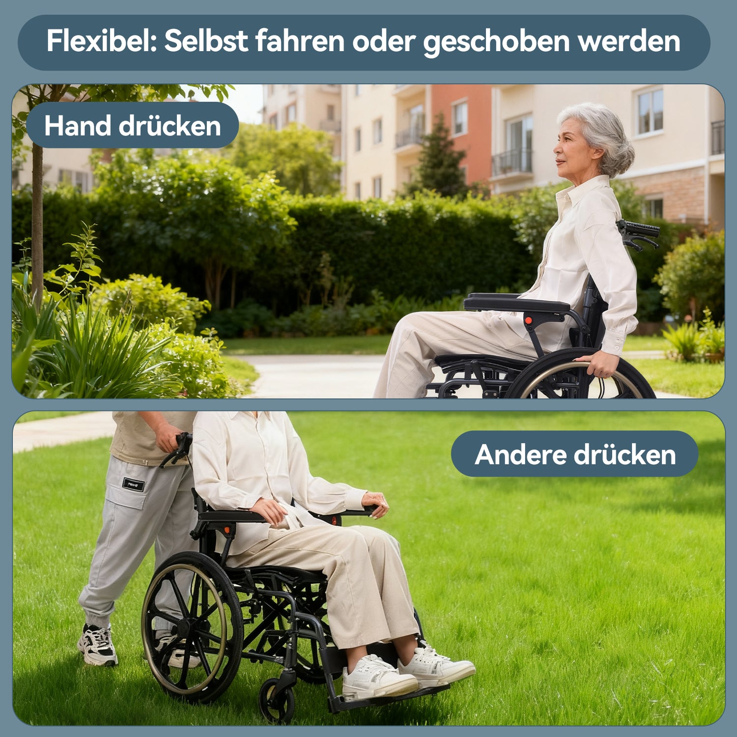 Der Rollstuhl kann sowohl selbstständig gefahren als auch von einer Begleitperson geschoben werden. Bietet flexible Unterstützung je nach Situation und individuellem Bedarf.