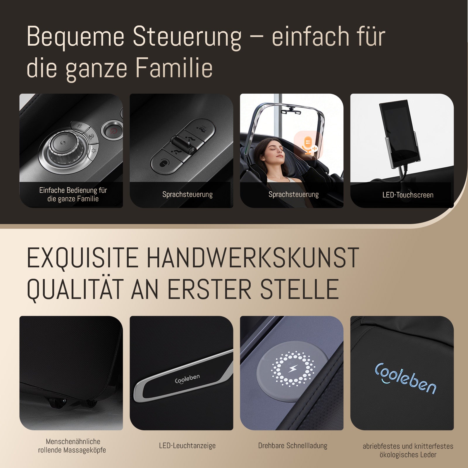 Der A553 überzeugt nicht nur durch seine Massageleistung, sondern auch durch eine besonders benutzerfreundliche Bedienung. Zur Ausstattung gehören Sprachsteuerung, LED-Touchscreen und eine einfach zugängliche Steuerung, die auch im Familienalltag angenehm zu nutzen ist. Ergänzt wird dies durch hochwertige Details wie menschenähnliche rollende Massageköpfe, LED-Leuchtanzeige, drehbare Schnellladung sowie abriebfestes und knitterfestes ökologisches Leder. Dadurch verbindet der Sessel moderne Technik mit langlebiger Verarbeitung und hohem Alltagskomfort.