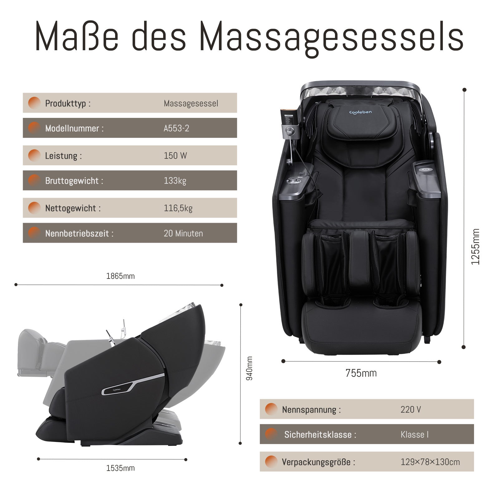 Der A553 kombiniert eine 3D-intelligente Massagemechanik mit einem 4D-Stahlrahmen mit Doppelantrieb und bietet dadurch ein besonders kraftvolles und zugleich präzises Massageerlebnis. Die Konstruktion unterstützt eine Liegeposition bis 166° und wird durch eine Ganzkörper-Airbag-Massage ergänzt, sodass Rücken, Schultern, Beine und weitere Körperbereiche umfassend entspannt werden. So entsteht ein modernes Massagegefühl, das auf Komfort, Tiefe und eine spürbar gleichmäßigere Ganzkörperentlastung ausgelegt ist.
